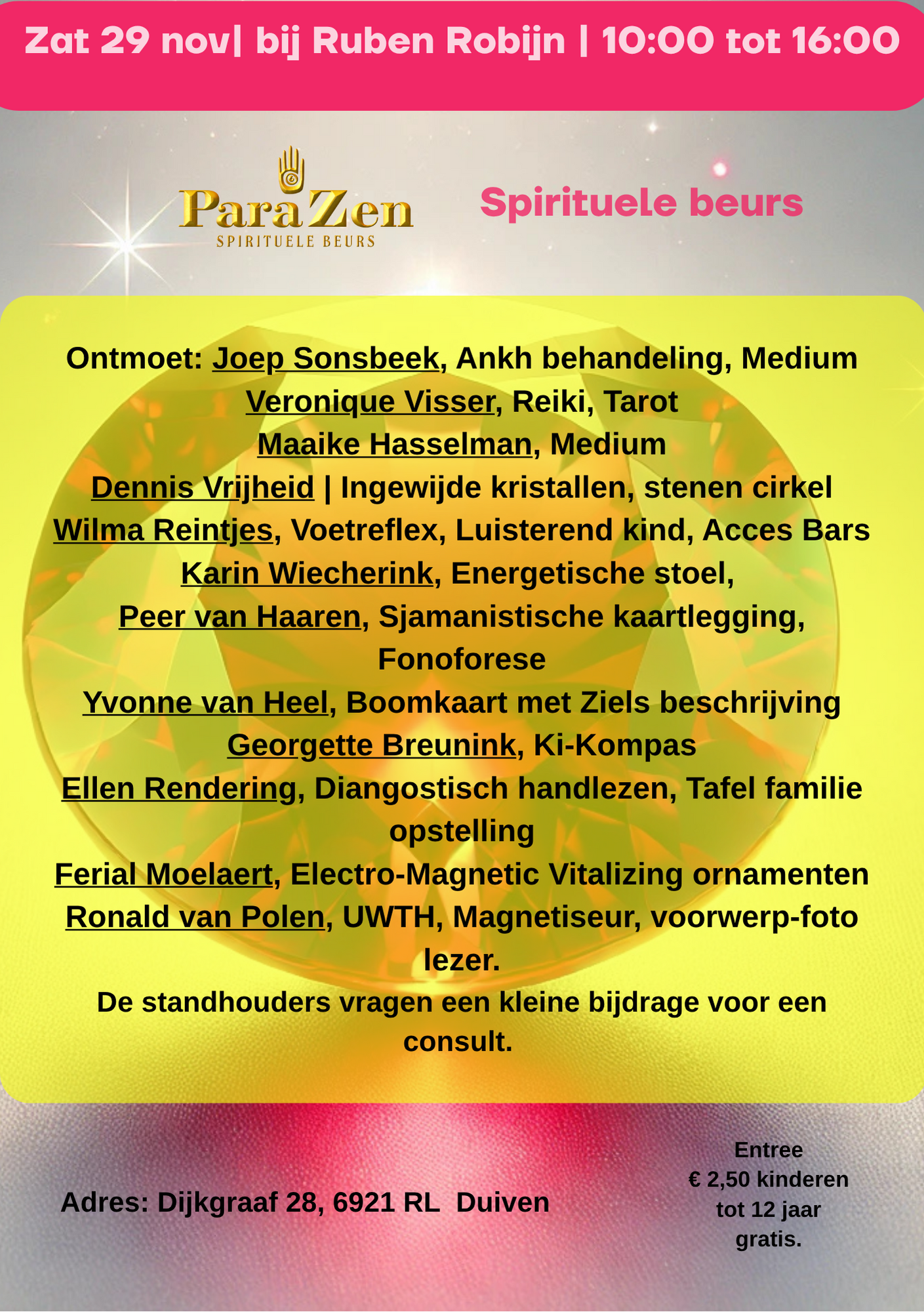 In samenwerking met het mineralenparadijs Ruben Robijn, al meer dan 20 jaar een begrip in ruwe mineralen en edelstenen, organiseert ParaZen iedere laatste zaterdag van de maand een betoverende Spirituele Beurs.